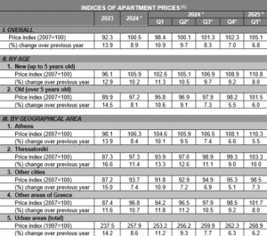 בתחילת יוני 2025 פרסם בנק יוון נתונים ראשוניים על מדד מחירי הדירות – והם משקפים המשך עליית ערך במגזר המגורים:
