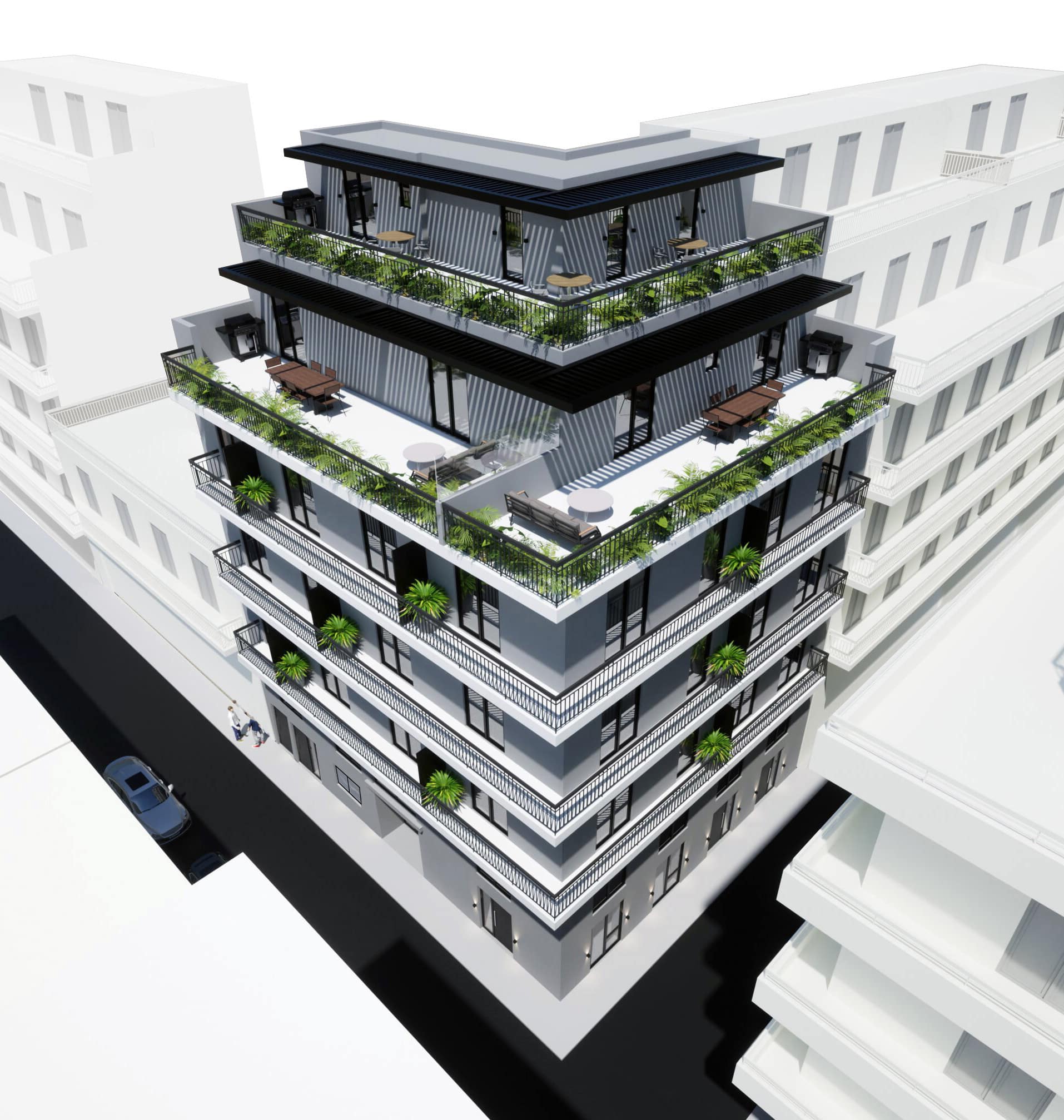 במרכז שכונת וטניקוס הצמודה לקרמיקוס וגאזי, בניין פינתי מרשים ביותר בעל 7 מפלסים. במסגרת הפרויקט, הבניין יעבור שיפוץ מקיף. הבניין יאובזר בשלל מתקנים משותפים, כמו מתחם כושר וחללי עבודה, חצר דיירים וגג דיירים מדהים עם נוף לאקרופוליס. בסיום הפרויקט, הדירות בבניין ישרתו את האוכלוסייה הצעירה באתונה המשוואת לדירות איכותיות להשכרה/רכישה באזורי הביקוש.