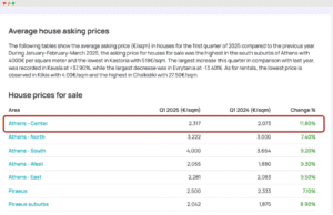 מגמות מחירים בשוק הנדל”ן באתונה מצביעות על עלייה עקבית בשווי הנכסים והמרכיבים של שוק ההשכרה לטווח קצר. אתונה ממצבת את עצמה כמרכז של הזדמנויות משמעותיות, כאשר מדד המחירים של אתר Spitogatos מצביע על עלייה מרשימה של 11.8% במחירי הדירות למכירה במרכז העיר ברבעון הראשון של 2025.